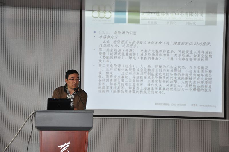 2013年10月19日,公司在六楼报告厅举行了“GB/T28001-2011 职业健康安全管理体系”培训讲座。本次讲座由北京中建协认证中心的魏爱军老师主讲,各生产单位领导、各项目部技术负责人、安全员及相关部门人员约20人参加培训。