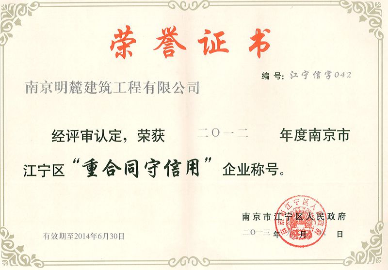 近期,我公司被江宁区人民政府授予“2012年度江宁区重合同守信用企业”荣誉称号,这也是我公司自2008年以来连续5年获此殊荣。
