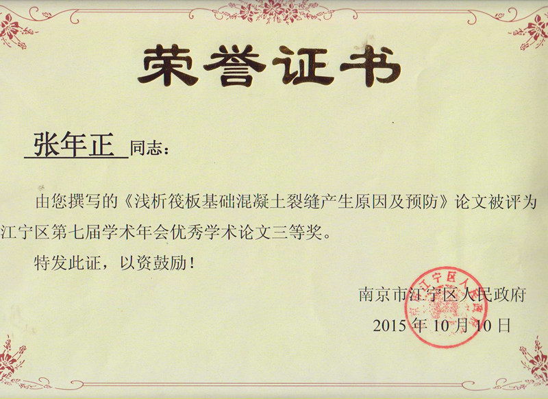 此次江宁区科协举办的科技论文征集评选活动,我公司共有12篇论文申报参评。其中,刁小波同志撰写的《紫金江宁科创服务中心观景平台工程型钢》被评为二等奖;张年正同志撰写的《浅析筏板基础混凝土裂缝产生原因及预防》被评为三等奖;周新华同志撰写的《关于在建筑施工中如何控制混凝土质量问题的思考》被评为优秀奖。获奖论文都由江宁区人民政府进行了表彰,并对获奖论文作者给予了奖励。