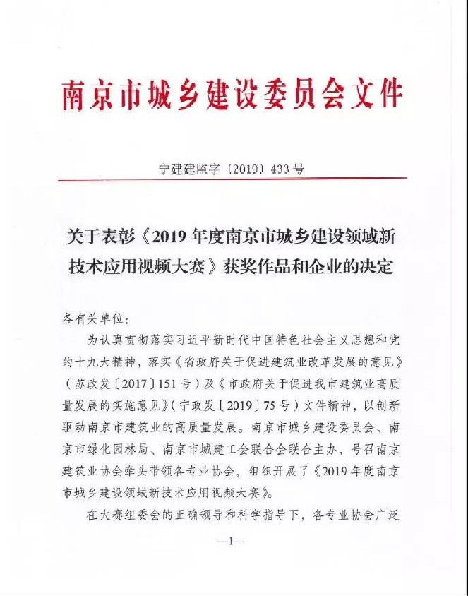 2019年度南京市城乡建设领域视频大赛以创新为主题,以全市城乡建设领域的新技术应用为着力点,以引领建筑业高质量发展为落脚点,通过开展以视频作品竞赛的方式展现新技术在行业内的推广应用,用实际行动践行国家、省、市有关推动建筑业转型升级和高质量发展的各项举措,并通过成果发布展示,相互取长补短、学习交流,以达到共同提高的目的,既展现了新时代建筑行业发展的新风貌,又让广大职工群众受到了教育,是推动建筑业高质量发展的一种工作创新,值得肯定。