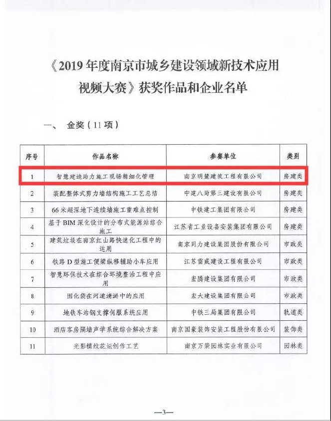 NEWS建筑资讯2019年11月29日上午,由南京市城乡建设委员会、南京市绿化园林局,南京市城建工会联合会主办、南京建筑业协会牵头带领各专业协会承办的“2019年度南京建筑业行业新技术应用和工艺操作标准视频大赛”颁奖典礼圆满落幕。明麓公司作品“智慧建造助力施工现场精细化管理”从近200家企业作品中脱颖而出,荣获2019年度新技术应用视频大赛金奖。