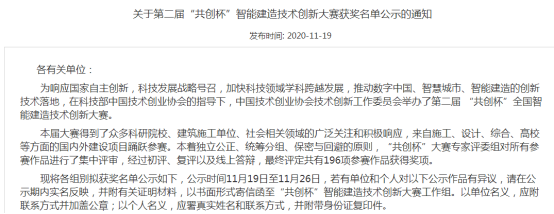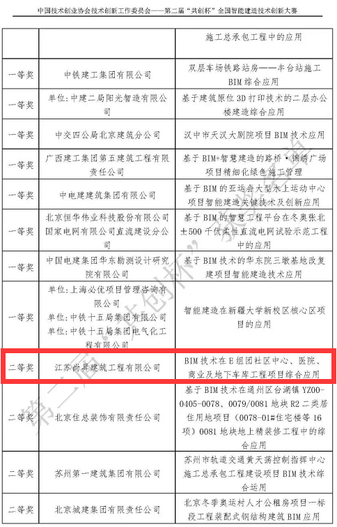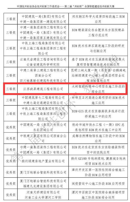 2020年11月19日,在第二届“共创杯”智能建造技术创新大赛中,江苏尚昇建筑工程有限公司经过初评、复评以及线上答辩,最终E组团社区中心、医院、商业及地下车库工程项目BIM综合应用荣获施工组二等奖,大树智能科技中心项目BIM综合应用荣获施工组三等奖。