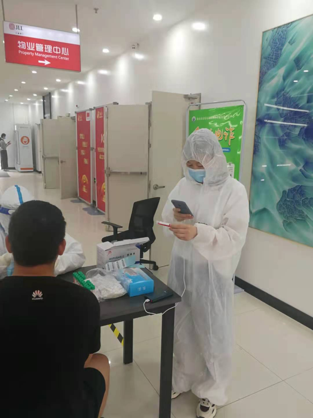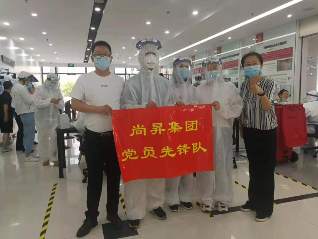7月25日上午8点,根据党委志愿者工作的分工安排,尚昇第一支党员先锋队的五名党员,参与到南岸瑞智文创园检测点、紫金研创中心检测点、南京师范大学附属小学(仙鹤门校区)等核酸检测点的工作开展中。党员志愿者们在酷暑中穿着防护服,戴着防护面罩,在核酸监测点维护现场秩序,为广大居民答疑解惑,同时配合医护人员进行取样、信息上传等工作。